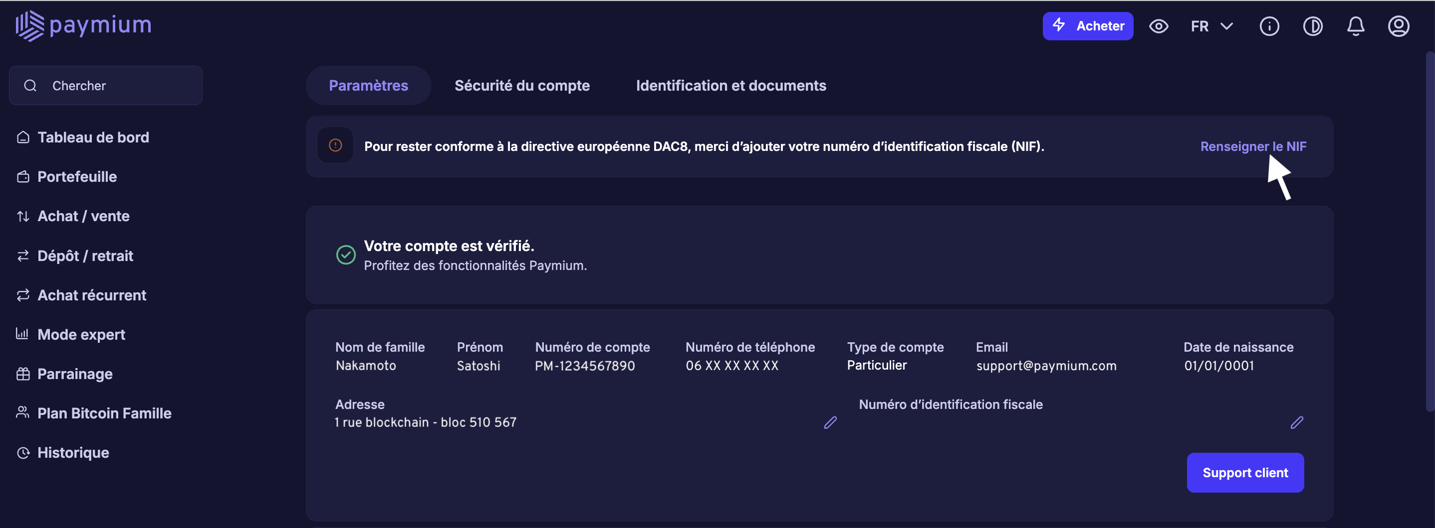 Pour rester conforme à la directive européenne DAC8, vous devez ajouter votre numéro d’identification fiscale (NIF) à votre compte Paymium.